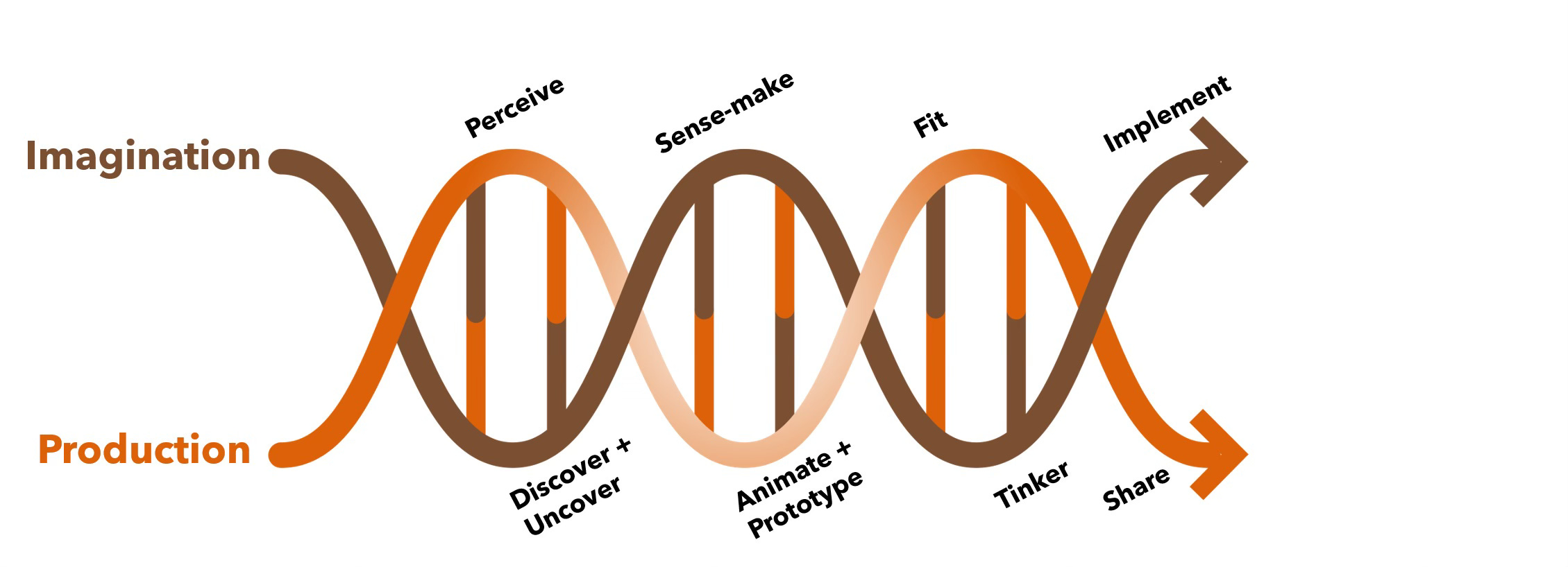 The Design Helix is a conceptual model of the entire design process, reflecting both the thinking and making aspects tied to design. It recognizes that an imaginative component is woven into making and that these are — as the visual metaphor suggests — like the building blocks of design. This is what is required to design for living systems — the services, products, and ecosystems where we live and work.
